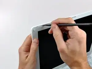 Вставьте плоский конец лопатки перпендикулярно лицевой части дисплея в зазор между передней и задней рамками рядом с верхним левым углом дисплея.