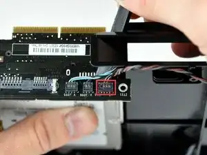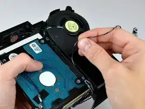 Используйте кончик лопаточки, чтобы снять чёрную электрическую ленту, натянутую между платой межсоединений и оптическим приводом.