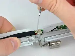 Снимите желтую ленту, удерживающую кабель данных дисплея к металлическому каркасу, и уберите единственный винт Philips, который находится под ней.