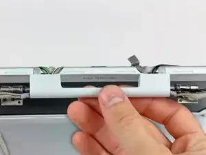 Наклоните дисплей назад, освобождая его от двух металлических направляющих, удерживающих шарниры на месте, и сдвиньте его вбок от себя.