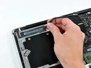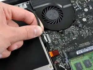 Используйте наконечник лопатки, чтобы отодвинуть фиксатор кабеля AirPort от его разъёма на плате AirPort.