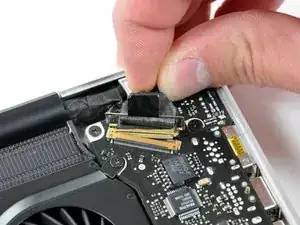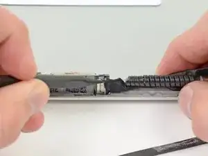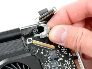 Используйте наконечник лопатки, чтобы откинуть тонкую стальную фиксирующую скобу, удерживающую кабель данных дисплея в его разъёме на ЖК-панели.