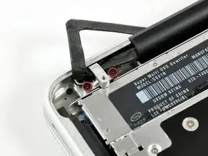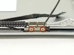 Снимите три винта Torx T6 2,5 мм, крепящие правую петлю к корпусу дисплея.