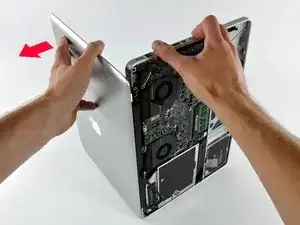 Возможно будет полезно одной рукой продвигать кабель данных дисплея через его канал в алюминиевом корпусе дисплея, пока другой рукой вы тянете ЖК-панель к верхнему краю.