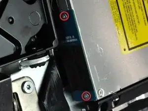 Удалите два винта Torx T6 длиной 3,5 мм, закрепляющие разъём оптического привода на оптическом приводе.