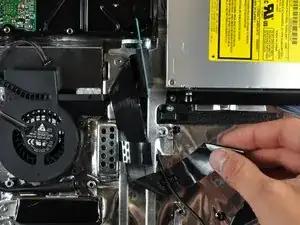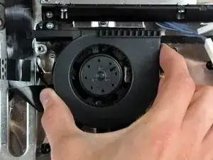 Поднимите вентилятор оптического привода вверх со стоек из пластика, выступающих из задней крышки.
