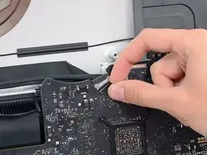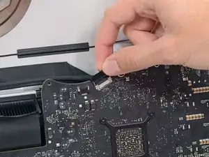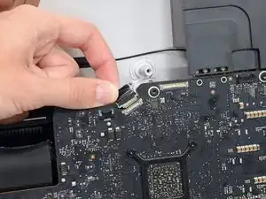 Это хрупкое соединение, которое легко повредить. Убедитесь, что вы вынимаете разъём кабеля данных дисплея строго по направлению из разъёма, вверх по отношению к iMac.