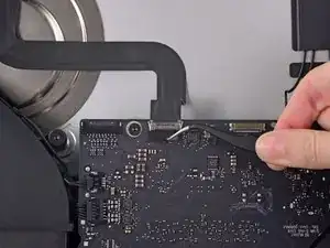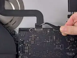 Используйте пинцет, чтобы захватить и откинуть металлическую фиксирующую скобу вверх, чтобы отщёлкнуть разъём кабеля камеры iSight на логической плате.
