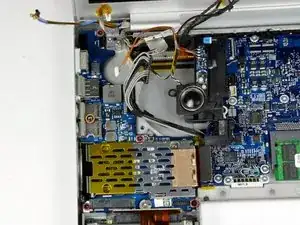 Поднимите сборку левого динамика из её отсека и поместите её в область, ранее занимаемую левым вентилятором.