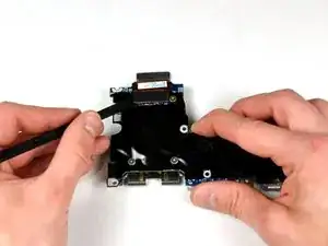 С помощью лопатки отключите кабель динамика от угла левой платы ввода/вывода.