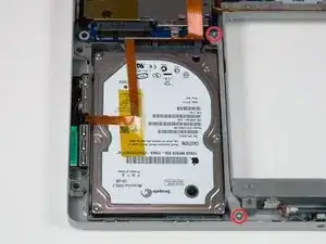 Снимите два серебристых Torx T6 винта, крепящих серую металлическую держатель к правой стороне жёсткого диска.