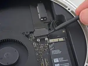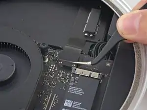Подсуньте плоский конец лопатки под кабель SSD, чтобы отлепить его от клея, который держит его в Mac mini.