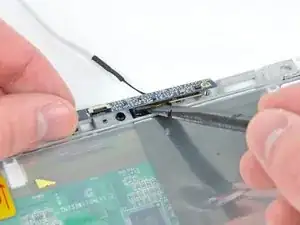Поднимите чёрный кабель правого динамика одной рукой и отведите серебристый кабель микрофона от металлической прищепки непосредственно над правым слотом оперативной памяти.