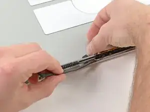 Используйте наконечник лопатки, чтобы откинуть тонкий стальной фиксатор, удерживающий кабель данных дисплея в его разъёме на ЖК-панели.