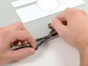 Вставьте кабель камеры в его разъём на плате камеры и с помощью наконечника лопатки зафиксируйте фиксатор ZIF, прижав его вниз, чтобы замкнуть кабель на месте.