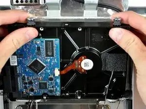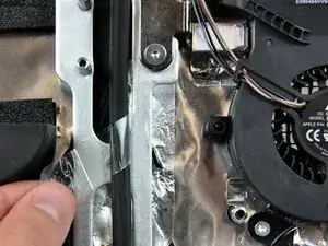 SATA-разъём на большинстве iMac имеет тенденцию заедать в гнезде на плате логики. Если трудно отсоединить кабель SATA, вставьте металлическую лопатку или другой тонкий инструмент в зазор между разъёмом SATA и его гнездом и поверните вал лопатки, чтобы безопасно разъединить обе части.