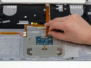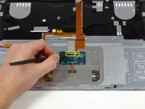 Отключите ленточный кабель трекпада и клавиатуры от платы логики, при необходимости удаляя ленту.