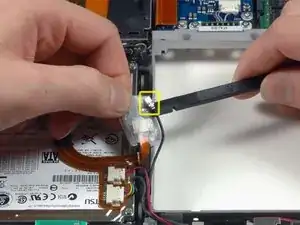 Выньте модуль Bluetooth из разъема рядом с жестким диском и с помощью лопатки отключите антенный кабель Bluetooth.