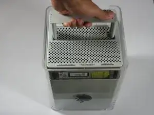 Освободите ручку внизу Power Mac G4 Cube, нажав вниз. Аккуратно вытащите куб, удерживая за конец ручки.