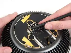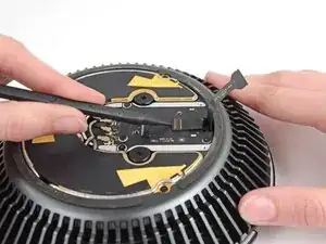 С помощью пинцета отведите скобу кабеля вентилятора от узла вентилятора.