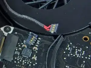 При повторном подключении кабеля AirPort убедитесь, что U-образные вырезы на одной стороне конца кабеля не видны (не обращены к плате). Если кабель установлен неправильно, это приведёт к повреждению логической платы.
