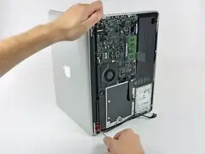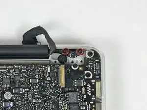 Удалите оставшийся винт с крестообразным шлицем (3 мм), закрепляющий сторону карты AirPort, ближайшую к правому шарниру сцепления.