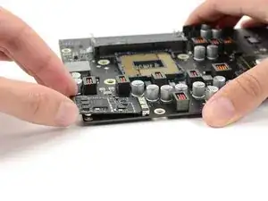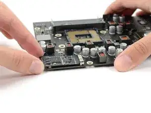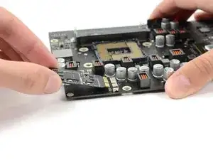 Чуть приподнесите конец карты AirPort/Bluetooth и вытяните её прямо из разъёма материнской платы.