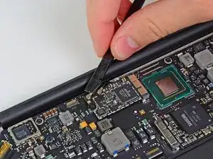 Схватите прозрачный пластиковый язычок, прикрепленный к разъемy батареи, и потяните его к переднему краю Air, чтобы отключить батарею от материнской платы.