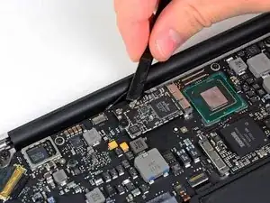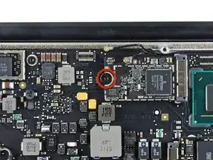 Удалите один винт T5 Torx длиной 2,9 мм, крепящий карту AirPort/Bluetooth к материнской плате.