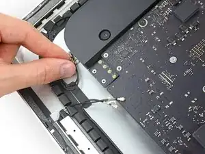 Осторожно отодвиньте антенные кабели в сторону, чтобы обеспечить доступ к плате AirPort/Bluetooth.