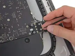 Удалите два винта T5 длиной 3,3 мм, которые крепят плату AirPort/Bluetooth к логической плате.