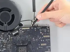 Если кабель приклеен к шасси, используйте нагреватель iOpener или фен, чтобы смягчить клей сначала. Затем можно поддеть под кабель лопаткой-подставкой, чтобы ослабить его. Никогда не тяните напрямую за деликатные разъёмы.
