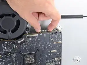 Удалите два винта T5 длиной 3,7 мм, фиксирующие карту AirPort/Bluetooth к плате логики.