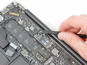 Используйте плоский конец лопатки, чтобы отжать оба антенных разъёма от их гнёзд на карте AirPort/Bluetooth.