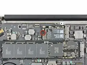 Удалите один 2,9 мм винт T5 Torx, фиксирующий карту AirPort/Bluetooth на логической плате.