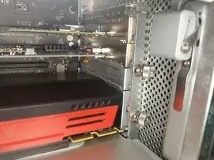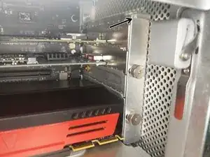 Если карта достаточно длинная, чтобы достать до слотов в корпусе вентилятора, или если карта зафиксирована в блокировочном зажиме рядом с портами PCI, вам нужно сдвинуть крышку корпуса вентилятора.