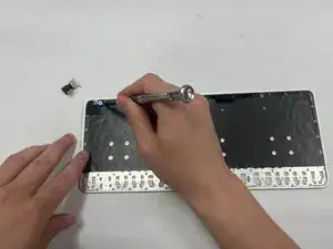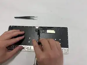 Пинцетом отсоедините переключатель питания от корпуса. Потяните горизонтально за весь узел, чтобы извлечь переключатель из клавиатуры.