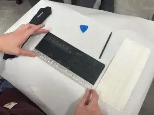 Маленькими пинцетом осторожно отсоедините шлейф и извлеките плату с клавиатуры.