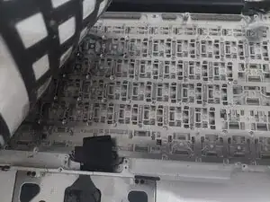 Мы начинаем с этапа, на котором верхний корпус со всеми компонентами уже безопасно снят, за исключением подсветки и клавиатуры. Теперь можно приступать к их снятию, установке новой клавиатуры и, при необходимости, новой подсветки.