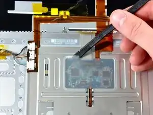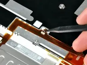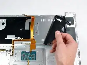 Используйте кончик лопатки, чтобы откинуть чёрную пластиковую защёлку, фиксирующую ленточный кабель клавиатуры.