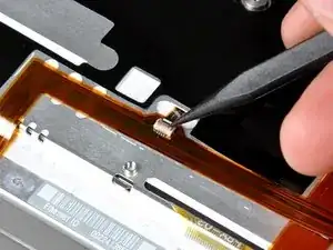 Будьте осторожны при снятии ленточного кабеля клавиатуры-трекпада, убедитесь, что задняя часть верхней крышки отщёлкнута в районе петли. Легко случайно погнуть стойки для винтов с обеих сторон клавиатуры.