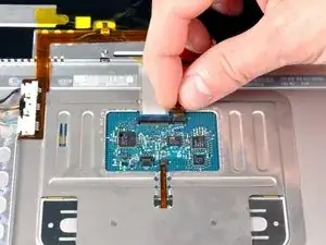 Отключите ленточный кабель трекпада и клавиатуры от логической платы, при необходимости удалив ленту.