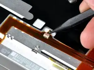 Используйте лопатку или палец, чтобы выдвинуть ленточный кабель подсветки клавиатуры из разъёма.