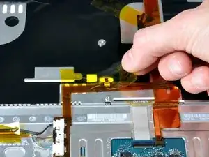 Вытяните ленточный кабель клавиатуры из его разъёма.
