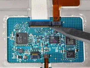 Используйте кончик лопатки, чтобы откинуть коричневую пластиковую защёлку, фиксирующую ленточный кабель подсветки клавиатуры.