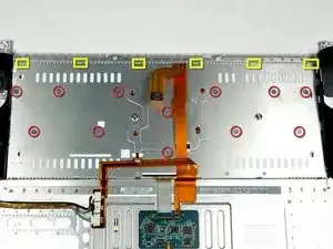 Удалите 12 одинаковых винтов Phillips, закрепляющих клавиатуру в корпусе.