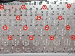 * Рекомендуется заранее снять как можно больше клавишных колпачков вместе с креплениями, так как стоит иметь запасные детали — они могут разлететься при удалении клавиатуры, и полезно иметь запас при ремонте ноутбуков Apple или в случае повреждения новой клавиатуры.