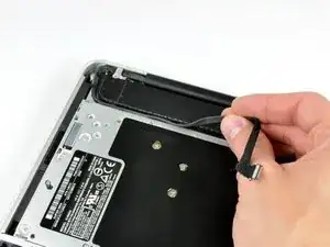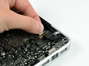 Выньте аккумулятор из MacBook, потянув за пластиковую язычок, прикреплённый к аккумулятору.
