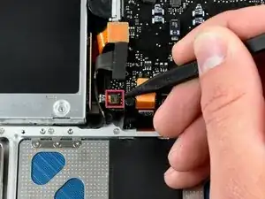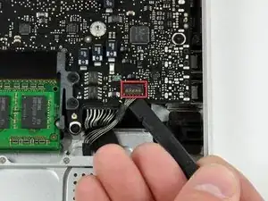 Используйте плоский конец лопатки, чтобы отжать кабель трекпада прямо от платы логики.