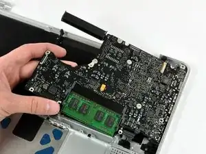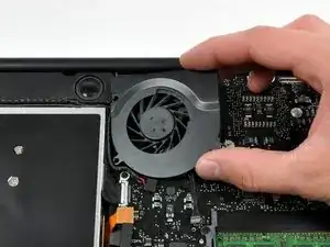 На втором и третьем снимках видны гнездо вентилятора и сам разъём. Будьте осторожны, чтобы не отломать пластиковое гнездо вентилятора от платы логики при подъёме разъёма вентилятора вверх и из его гнезда. На Вашем MacBook это может выглядеть немного иначе.